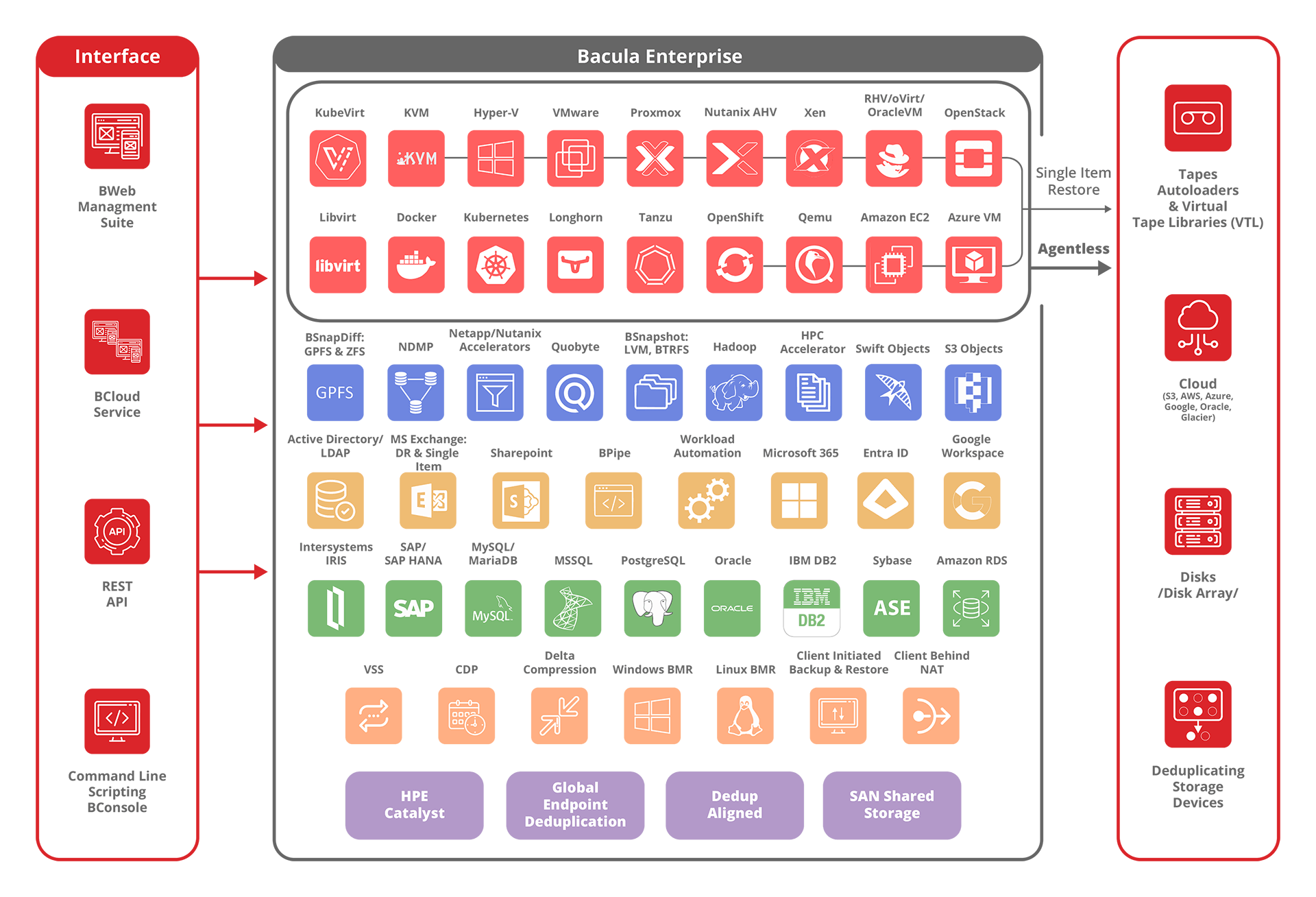 solution is enhanced by a set of exclusive tools that further increase the interoperability, power, flexibility and functionality of Bacula Enterprise into a wide range of IT environments such as enterprise data centers, managed service providers, software vendors or cloud providers.