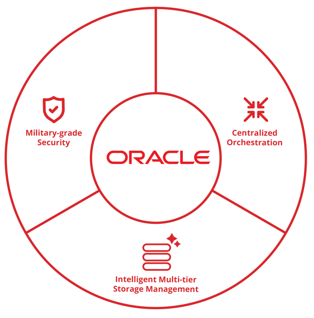 O Bacula Enterprise transforma a proteção do banco de dados Oracle, ampliando os recursos comprovados do RMAN com segurança de nível militar, gerenciamento inteligente de armazenamento em várias camadas e orquestração centralizada que unifica a proteção do Oracle em toda a sua infraestrutura.