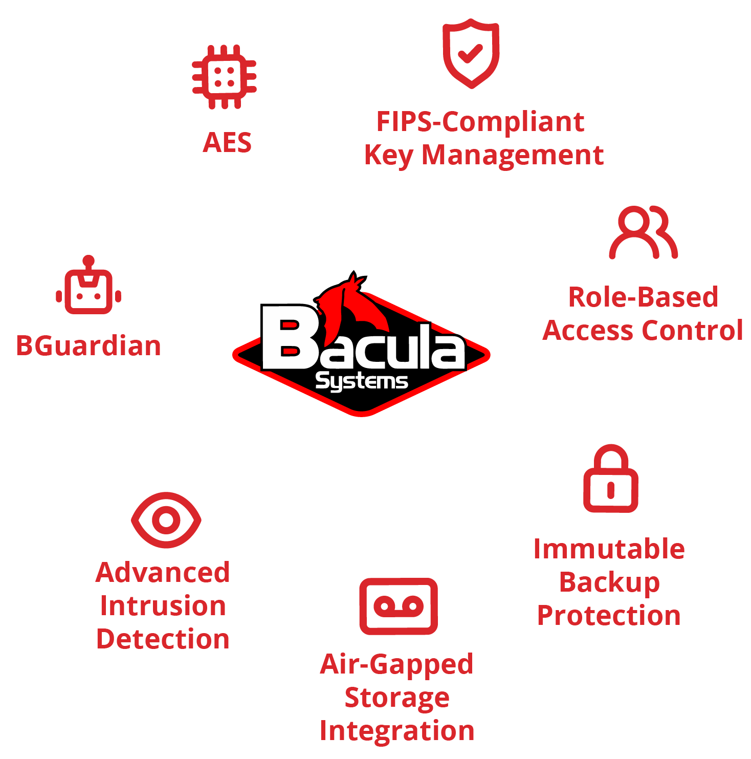O Bacula Enterprise oferece recursos de segurança de nível militar que contam com a confiança de agências governamentais, organizações de defesa e empresas com os mais rigorosos requisitos de segurança em todo o mundo. Seus recursos de segurança incluem: